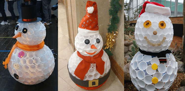 Spodní kouli sněhuláka si sešijte s hlavou a krk mu převažte šálou, dodělejte sněhulákovi nos i oči a dejte mu pokrývku hlavy. Jako knoflíky a oči můžete třeba dovnitř kelímků vložit i zmačkaný černý, hnědý, modrý či jinak barevný papír nebo starý had či ponožky. Místo nosu stočte do kornoutu silnější barevný papír. Pokud budete svého sněhuláka stavět ven, musíte jej uvnitř vybavit důkladným závažím, aby vám ve větru někam neuletěl a neustále vám nepadal. Vyrobte si i vánoční ozdoby na stromeček.
